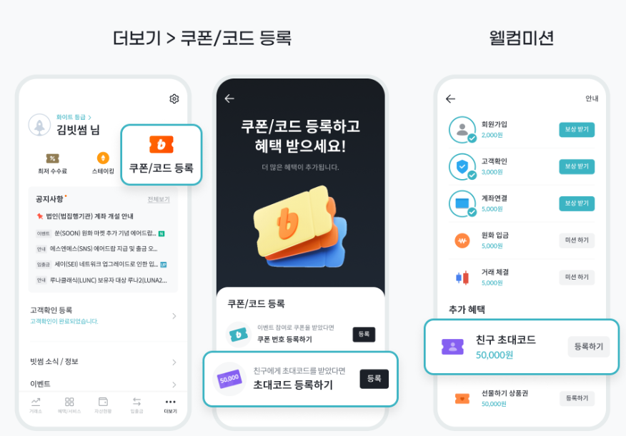 - 가입 후 빗썸 앱의 [웰컴미션이벤트] 탭 꼭 확인하세요. 🎈